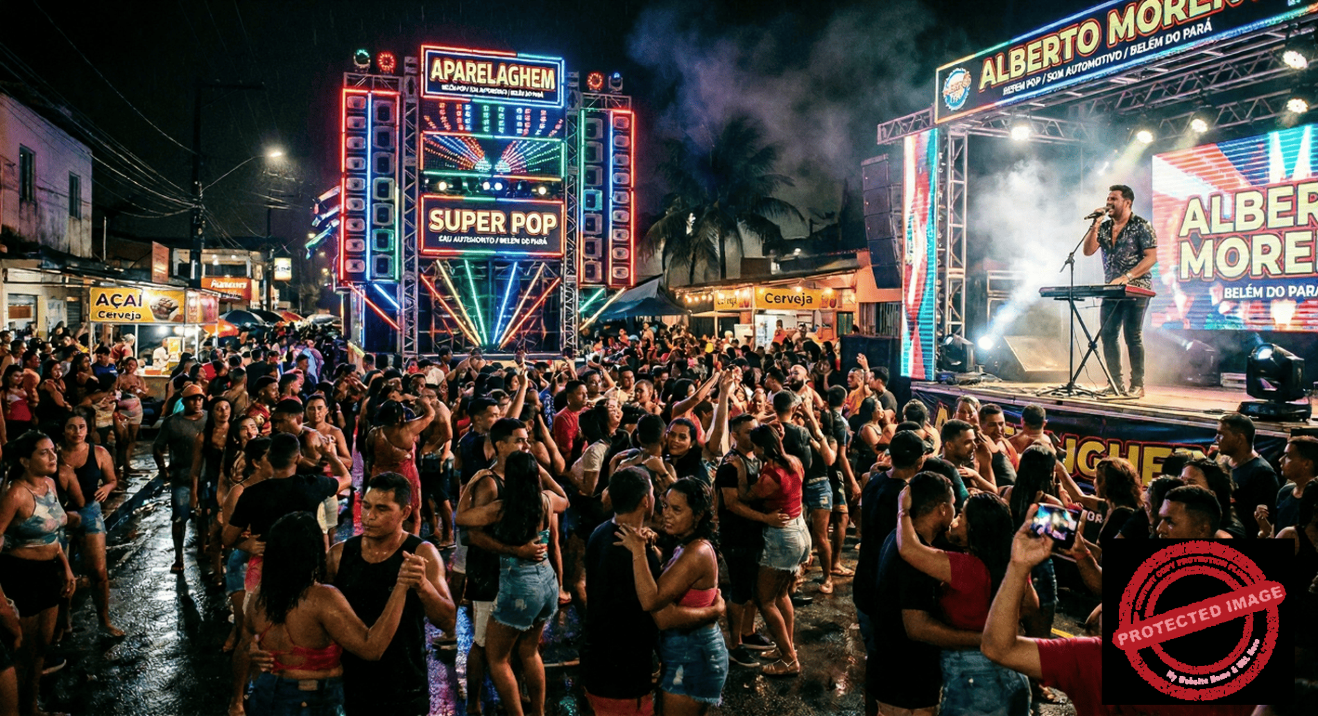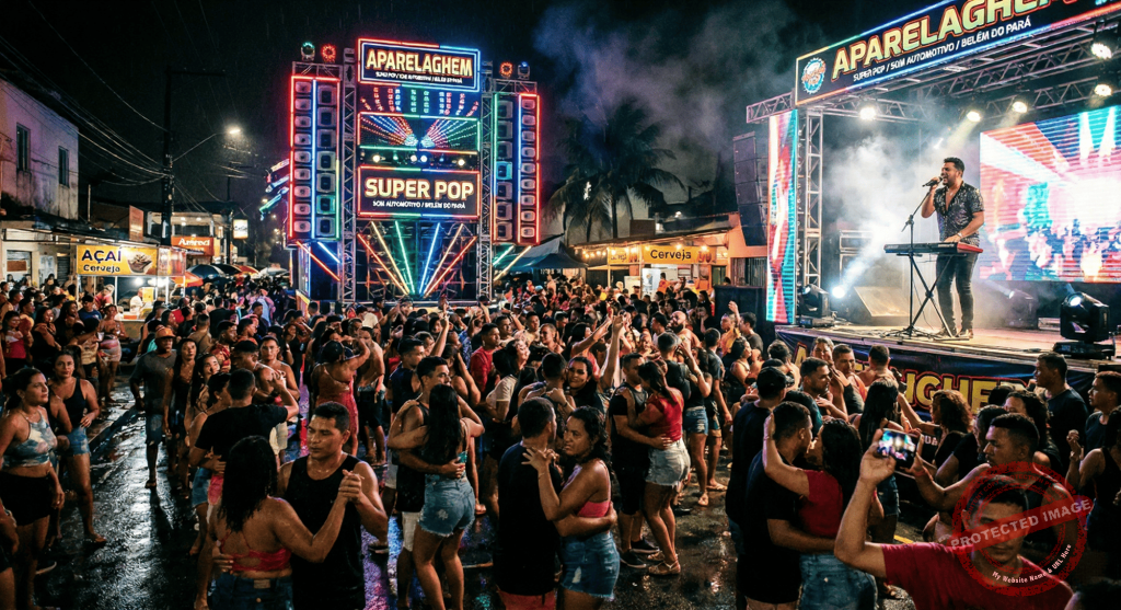 A cinematic, highly detailed and vibrant wide shot illustrating a lively peripheral street party at night in the Amazonian city of Belém do Pará. The scene captures the exact cultural essence of a massive “Aparelhagem” sound system culture in the middle of a neighborhood. In the background, a colossal, futuristic sound system (aparelhagem) towers with intricate arrays of LED lights in neon reds, deep blues, and bright greens, emitting a mystical and highly energetic glow. A charismatic male singer, reminiscent of classic 90s Brega Pop stars, is performing passionately on a raised stage setup, holding a microphone while energetically playing a modern electronic keyboard. The audience, a dense and diverse crowd of cheerful “caboclo” and urban locals, are dancing tightly together (“agarradinho”) in a romantic, festive, and sweat-drenched atmosphere. Puddles on the ground reflect the neon lights after a recent, heavy tropical rain (“toró”). Subtle local Amazonian elements in the background, such as silhouettes of açaí palm trees and a hint of rustic, peripheral architecture, with mist and stage smoke creating a dramatic, immersive, and magical tropical nightlife mood.